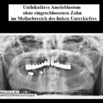 Ἡ πανοραμικὴ ἀκτινογραφία τὴν ὁποῖα διενεργήσαμε (εἰκ. 1), ἔδειξε, πλησίον τῆς γωνίας τῆς κάτω γνάθου ΑΡ, κυστικὸ μόρφωμα, μὲ σαφῆ ὅρια (ἐξαιρουμένης μόνον τῆς ἔξω παρυφῆς του πρὸς τὸν σύστοιχο κλάδο τῆς κάτω γνάθου), ὅπου ὑπῆρχε μόλις ὑποσημαινόμενη ἀσαφοποίηση, ἡ δὲ παρυφὴ τοῦ κυστικοῦ μορφώματος ἐδῶ προσελάμβανε τὴν μορφὴ δίκην «γιρλάντας», τὸ δὲ ἐνδοκυστικὸ μέρος τοῦ τοιχώματος, κατὰ τὴν ἔξω καὶ κάτω παρυφὴ του, ἐνεφάνιζε ἀνώμαλες ὀστικὲς προσεκβολές, ἐναλασσόμενες μὲ διαυγαστικὲς μικρὲς ἑστίες, εἰκόνα προσομοιάζουσα μὲ τὴν ἀντίστοιχη δίκην «μελισσοκηρήθρας ἢ μωσαϊκοῦ». Στὸ κυστικὸ μόρφωμα δὲν ἐνυπῆρχαν ἔγκλειστοι ὀδόντες. Ἡ διαφορικὴ διάγνωση δὲν ἦταν εὔκολη γιὰ ἐμᾶς, διότι ἔπρεπε νὰ ἀναφέρουμε σειρὰ παθήσεων ποὺ προκαλοῦν παρόμοια ἀκτινολογικὰ εὑρήματα. Συμπεριλάβαμε λοιπὸν πέραν τοῦ ἀμελοβλαστώματος, τὴν μονοοστικὴ ἰνώδη δυσπλασία, τὴν θυλακιώδη κύστη, τὴν κερατινοκύστη, τὸ ὀδοντογενὲς μύξωμα καὶ τὸ ἠωσινόφιλο κοκκίωμα.